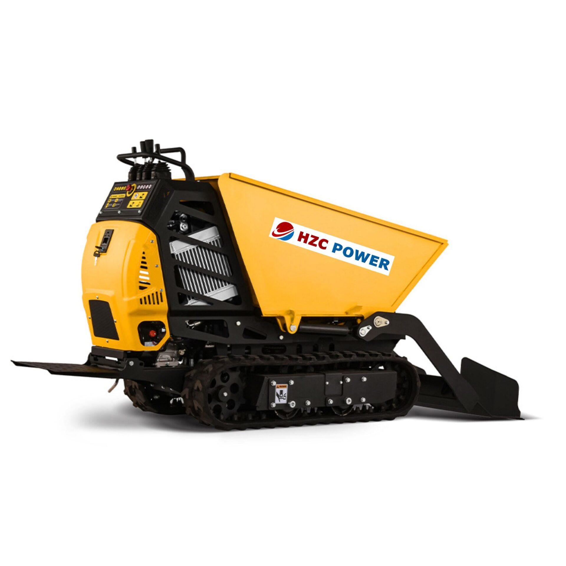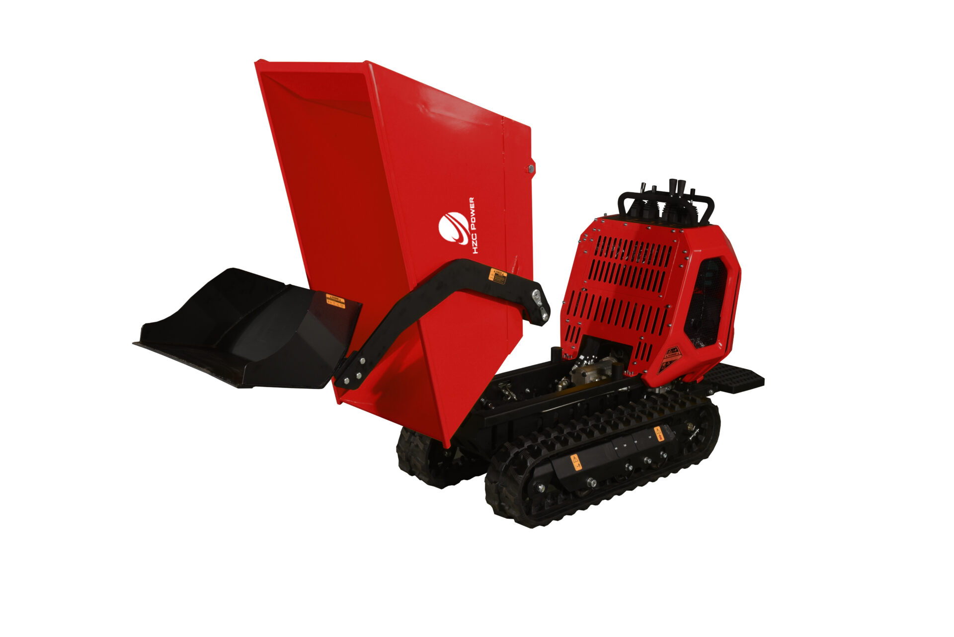 Med MDK800SH med hydraulisk självlastande skopa från HZC Power får du en högkvalitativ minidumper med bandchassi. Det som gör denna minidumper unik är att den har hydrostatisk drift, vilket innebär att den är helt hydraulisk. Den hydrostatiska drivningen ger flera fördelar: steglös hastighetsreglering, högt vridmoment, linjär rörelse med hög effektivitet, säkrare och snabbare överlastningsskydd, längre livslängd, mindre underhåll och mindre slitage (mindre friktion jämfört med vanliga växlar), även under full belastning. Dessutom har den en annan unik funktion – den hydrauliska självlastande skopan, som gör arbetet mycket enklare eftersom dumpern kan lasta och lossa samtidigt med sin hydrauliska kraft. Detta gör det möjligt att ladda dumpern utan ansträngning.
